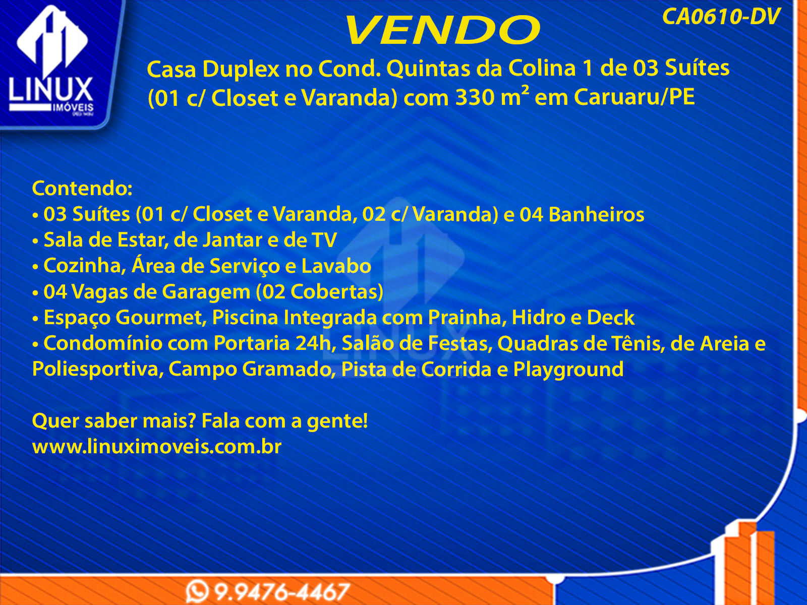 Casa Duplex no Cond. Quintas da Colina 1 em Caruaru/PE à Venda (CA0610-DV)