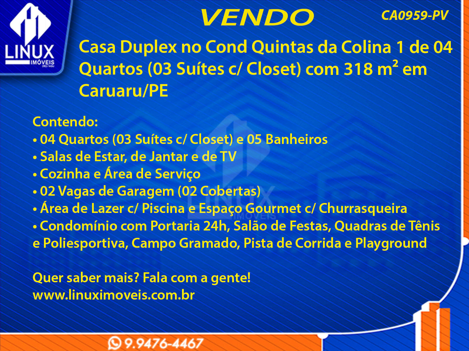 Casa Duplex no Cond Quintas da Colina 1 em Caruaru/PE à Venda (CA0959-PV)