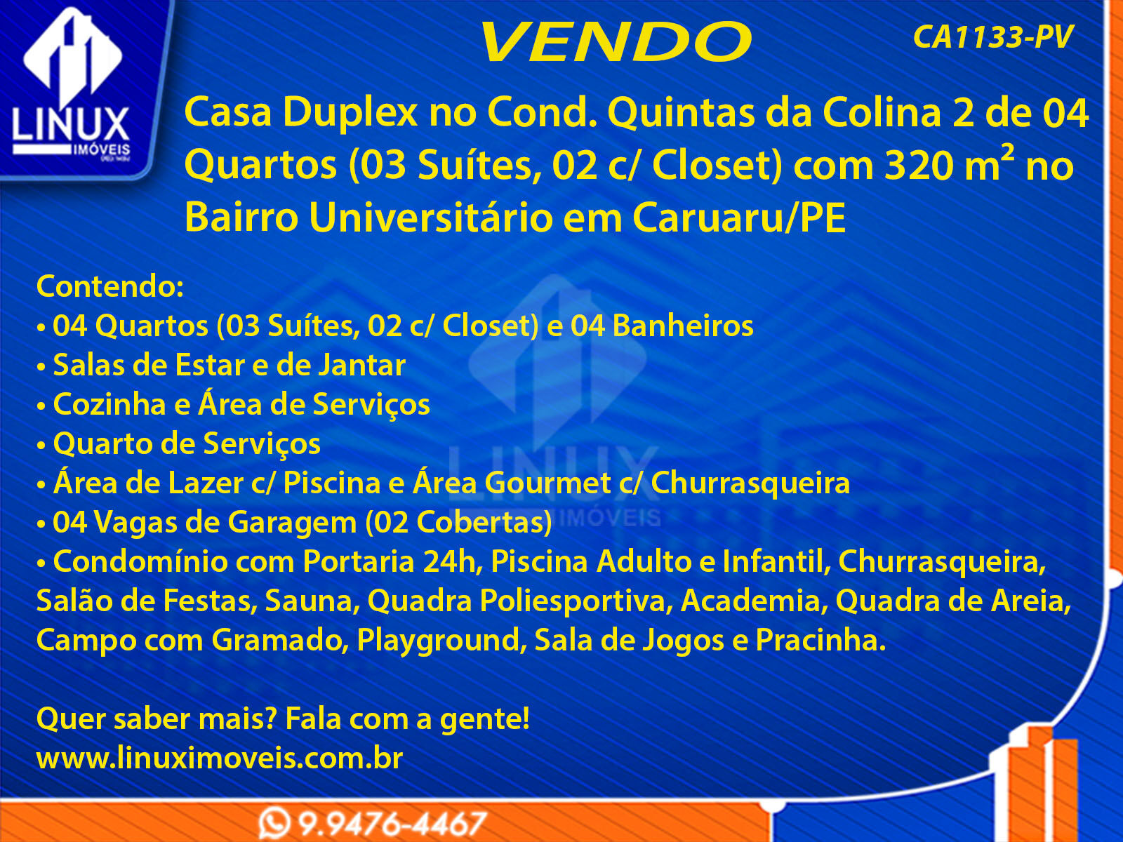 R$1.850.000,00 / VENDACasa Duplex no Cond. Quintas da Colina 2 em Caruaru/PE à Venda (CA1133-PV)