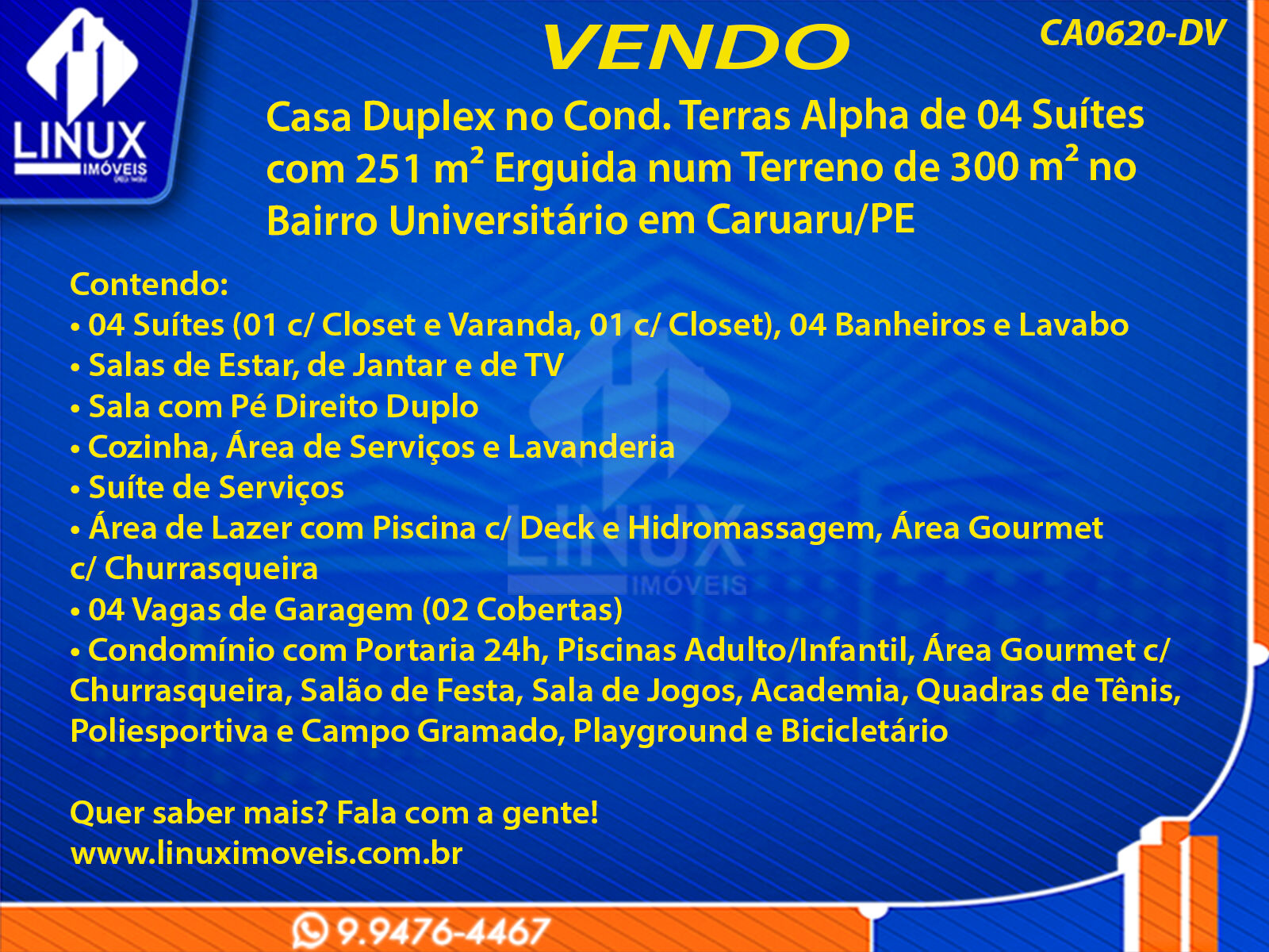 Casa Duplex no Cond. Terras Alpha de 04 Suítes com 251 m² Erguida num Terreno de 300 m² no Bairro Universitário em Caruaru/PE