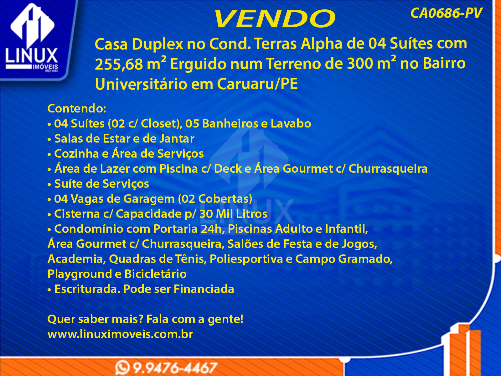 Casa Duplex no Cond. Terras Alpha de 04 Suítes com 255,68 m² Erguido num Terreno de 300 m² no Bairro Universitário em Caruaru/PE