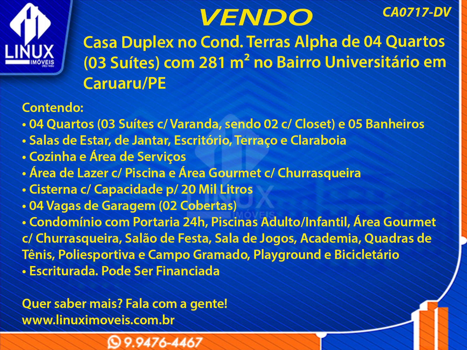 Casa Duplex no Cond. Terras Alpha em Caruaru/PE à Venda (CA0717-DV)