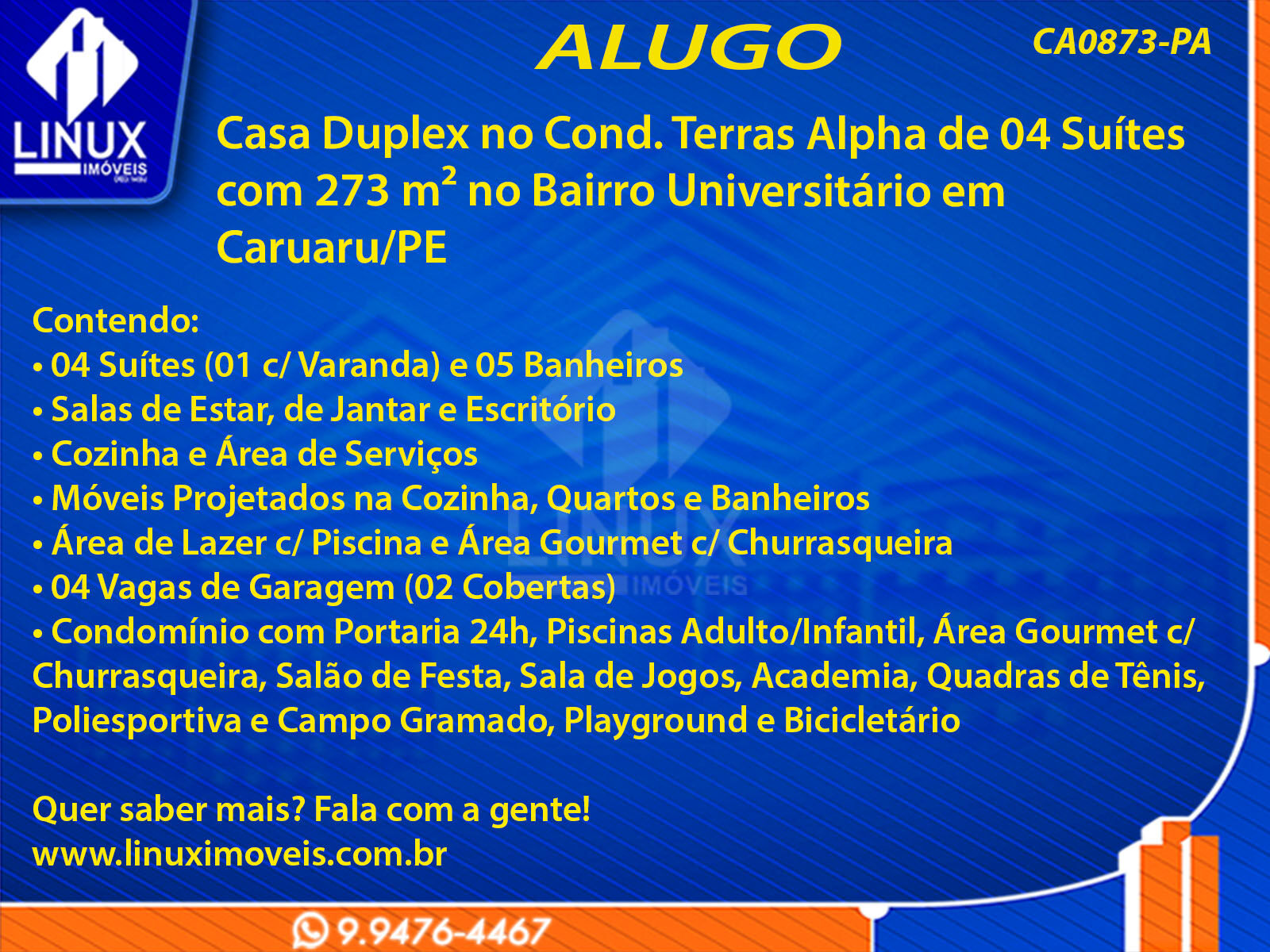 R$13.000,00 / ALUGUELCasa Duplex no Cond. Terras Alpha p/ Locação (CA0873-PA)