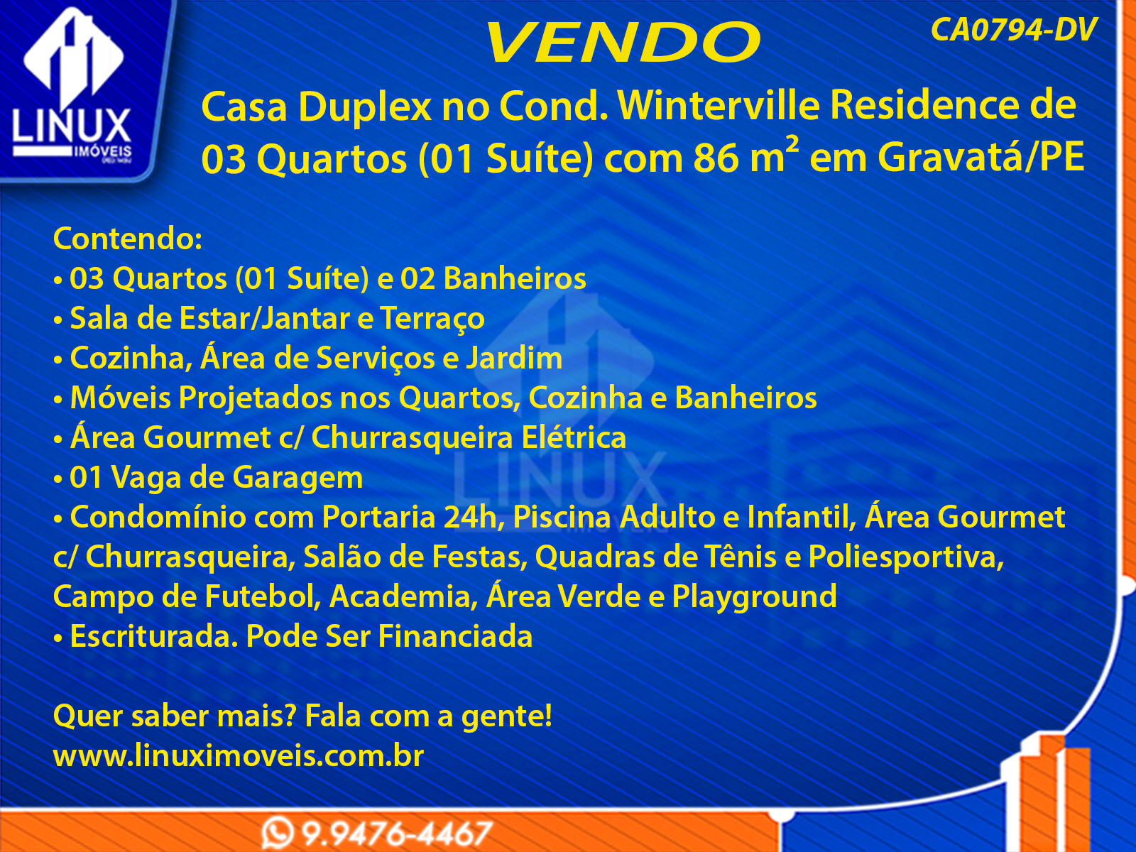 Casa Duplex no Cond. Winterville Residence Suítes de 03 Quartos (01 Suíte) com 86 m² em Gravatá/PE