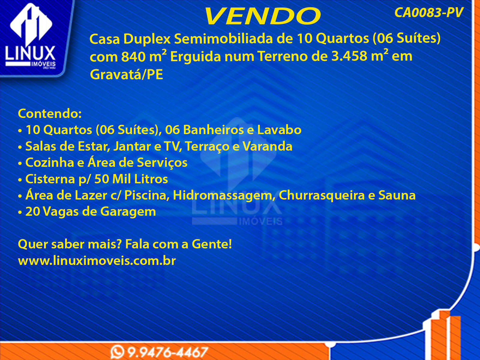 R$3.700.000,00 / VENDACasa Duplex Semimobiliada em Gravatá/PE à Venda (CA0083-PV)