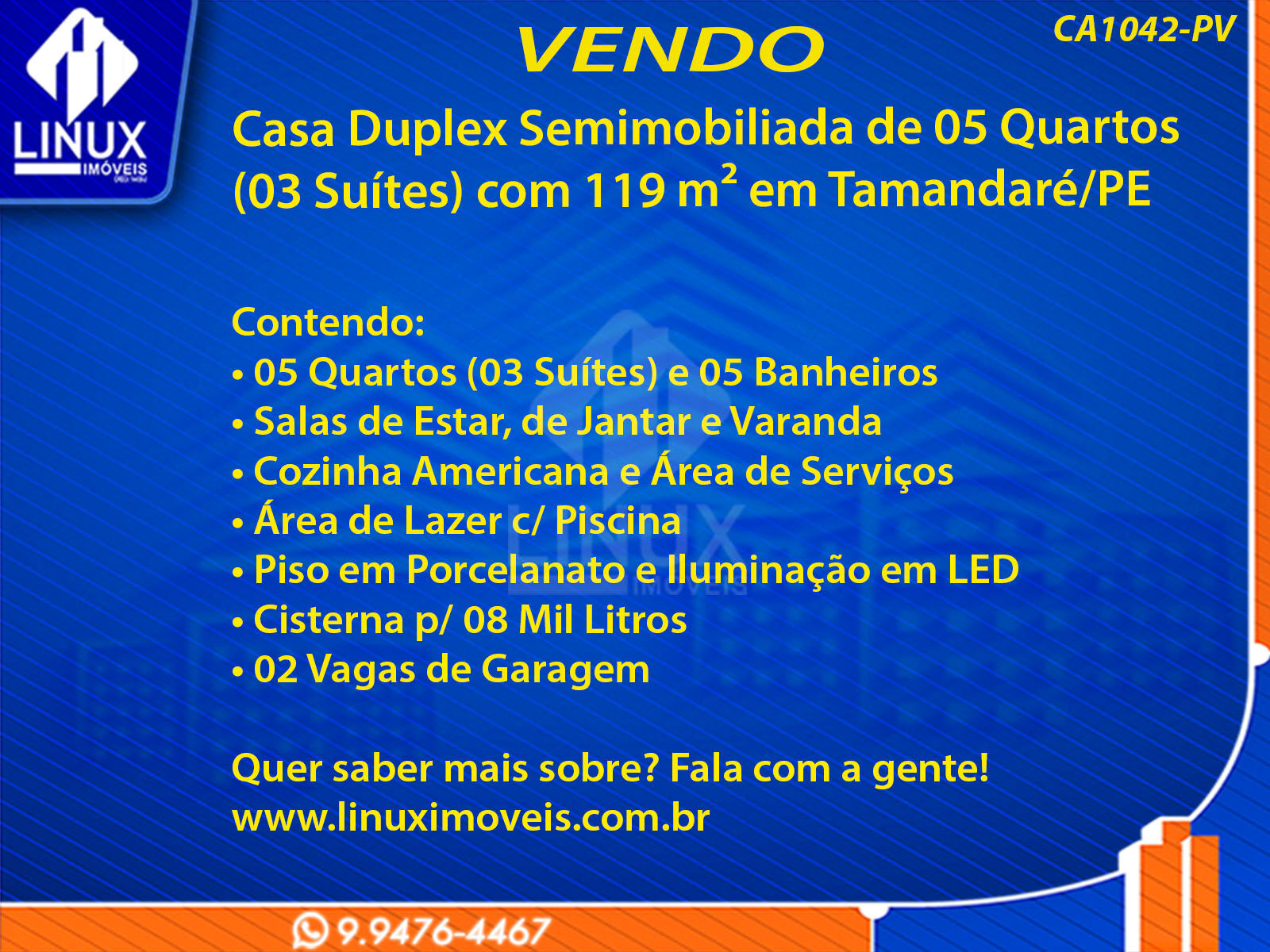Casa Duplex Semimobiliada de 05 Quartos (03 Suítes) com 119 m² em Tamandaré/PE