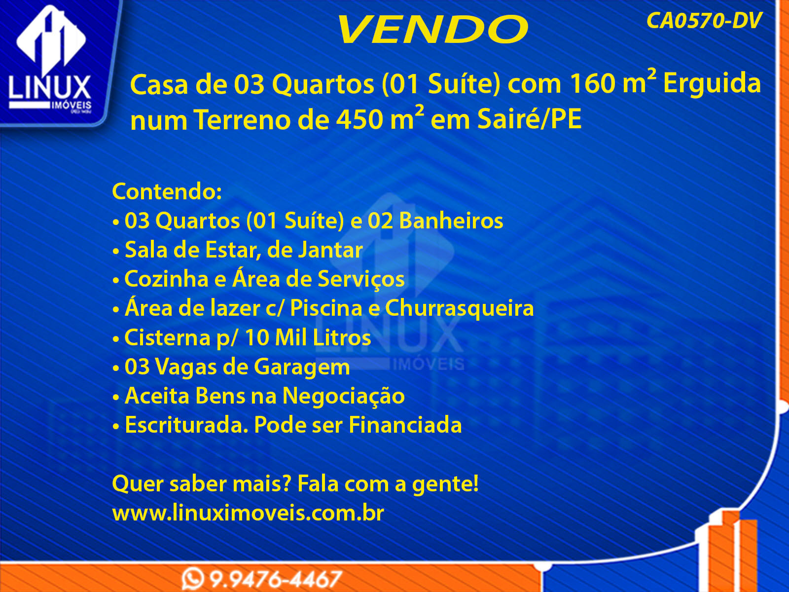 R$330.000,00 / VENDACasa em Sairé/PE à Venda (CA0570-DV)