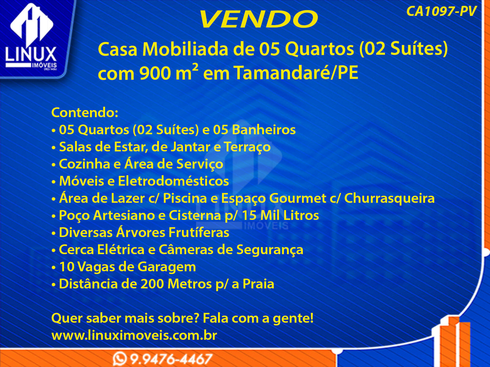 Casa Mobiliada de 05 Quartos (02 Suítes) com 900 m² em Tamandaré/PE
