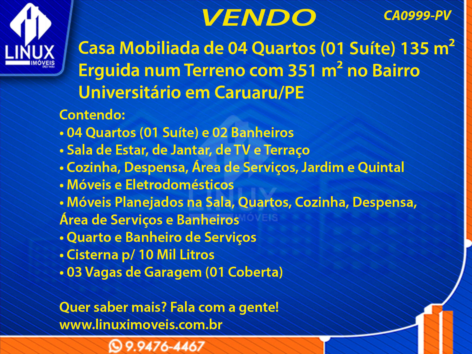 Casa Mobiliada no Bairro Universitário em Caruaru/PE à Venda (CA0999-PV)