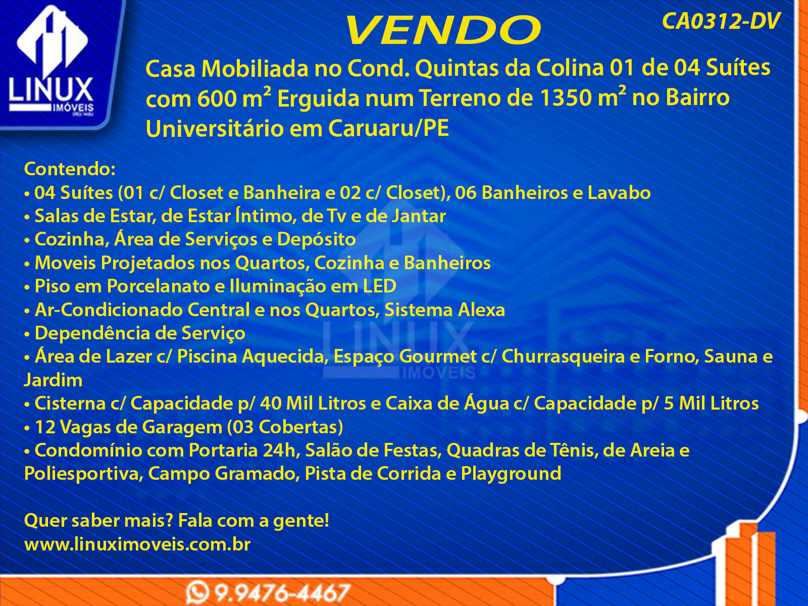 Casa Mobiliada no Cond. Quintas da Colina 1 de 04 Suítes (01 c/ Closet e Banheira e 02 c/ Closet) com 600 m² Erguida num Terreno de 1350 m² no Bairro Universitário em Caruaru/PE