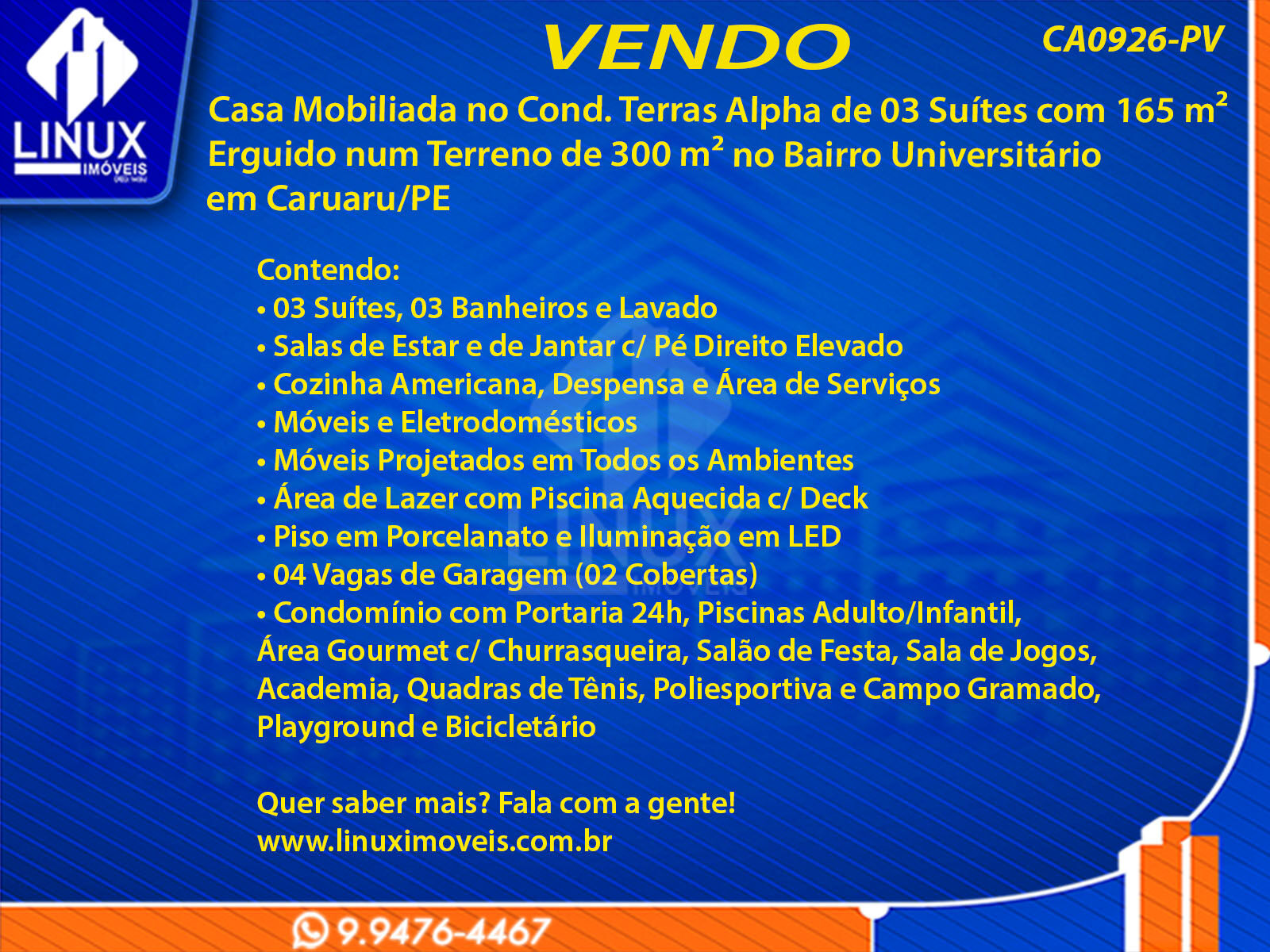 Casa Mobiliada no Cond. Terras Alpha em Caruaru/PE à Venda (CA0926-PV)