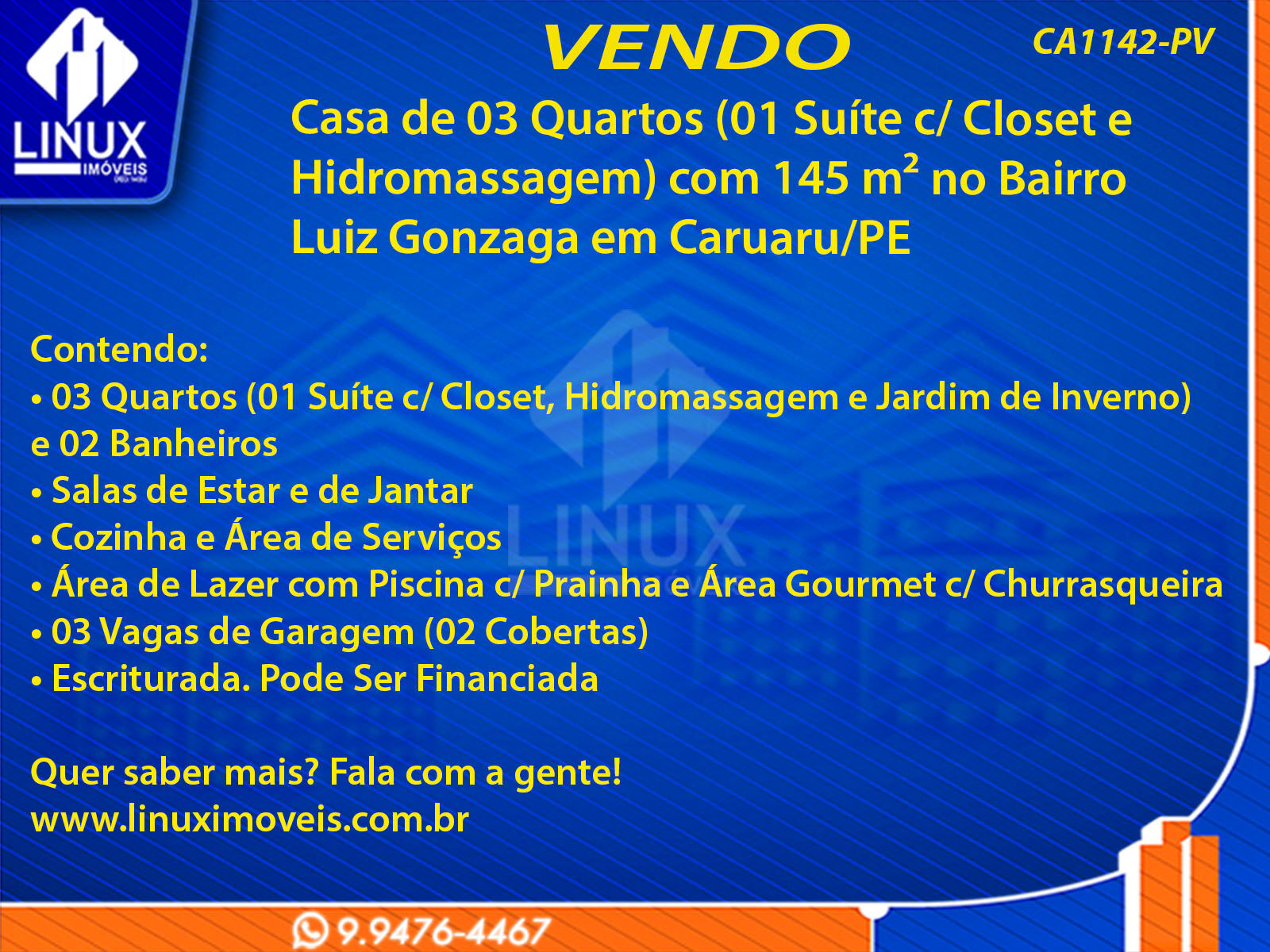 Casa de 03 Quartos (01 Suíte c/ Closet e Hidromassagem) com 145 m² no Bairro Luiz Gonzaga em Caruaru/PE