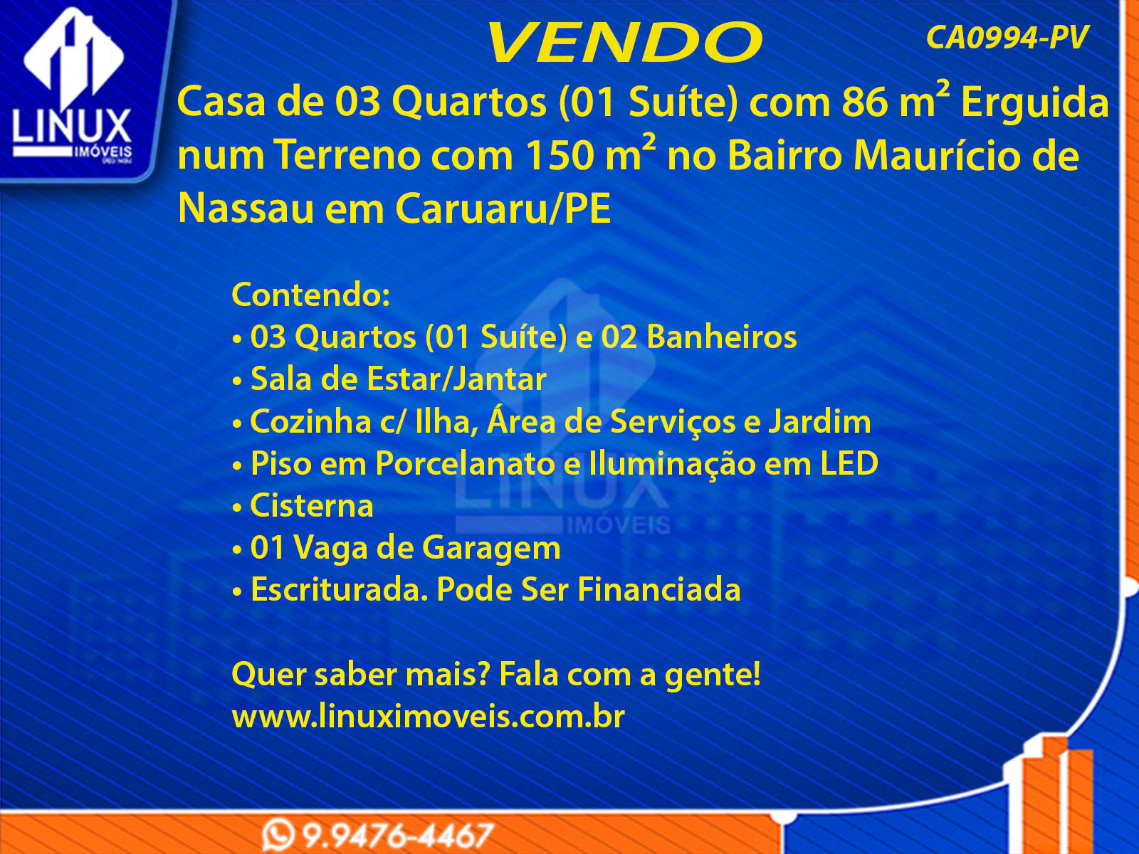 Casa de 03 Quartos (01 Suíte) com 86 m² Erguida num Terreno com 150 m² no Bairro Maurício de Nassau em Caruaru/PE