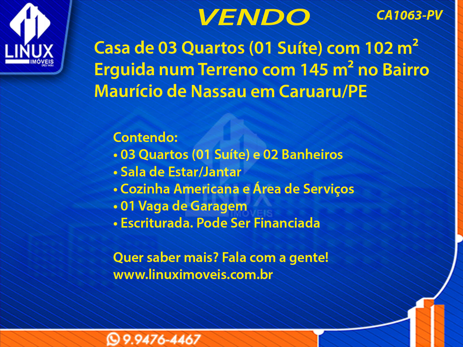 Casa de 03 Quartos (01 Suíte) com 102 m² Erguida num Terreno com 145 m² no Bairro Maurício de Nassau em Caruaru/PE