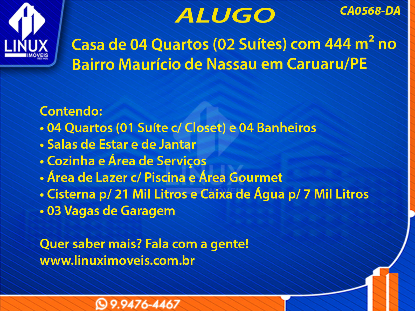 R$4.500,00 / ALUGUELCasa no Bairro Maurício de Nassau em Caruaru/PE p/ Locação (CA0568-DA)
