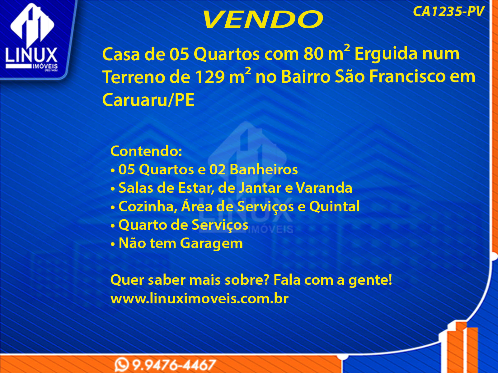 Casa de 05 Quartos com 80 m² Erguida num Terreno de 129 m² no Bairro São Francisco em Caruaru/PE