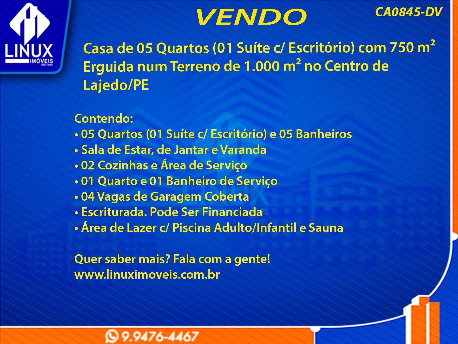 R$1.500.000,00 / VENDACasa no Centro de Lajedo/PE à Venda (CA0845-DV)