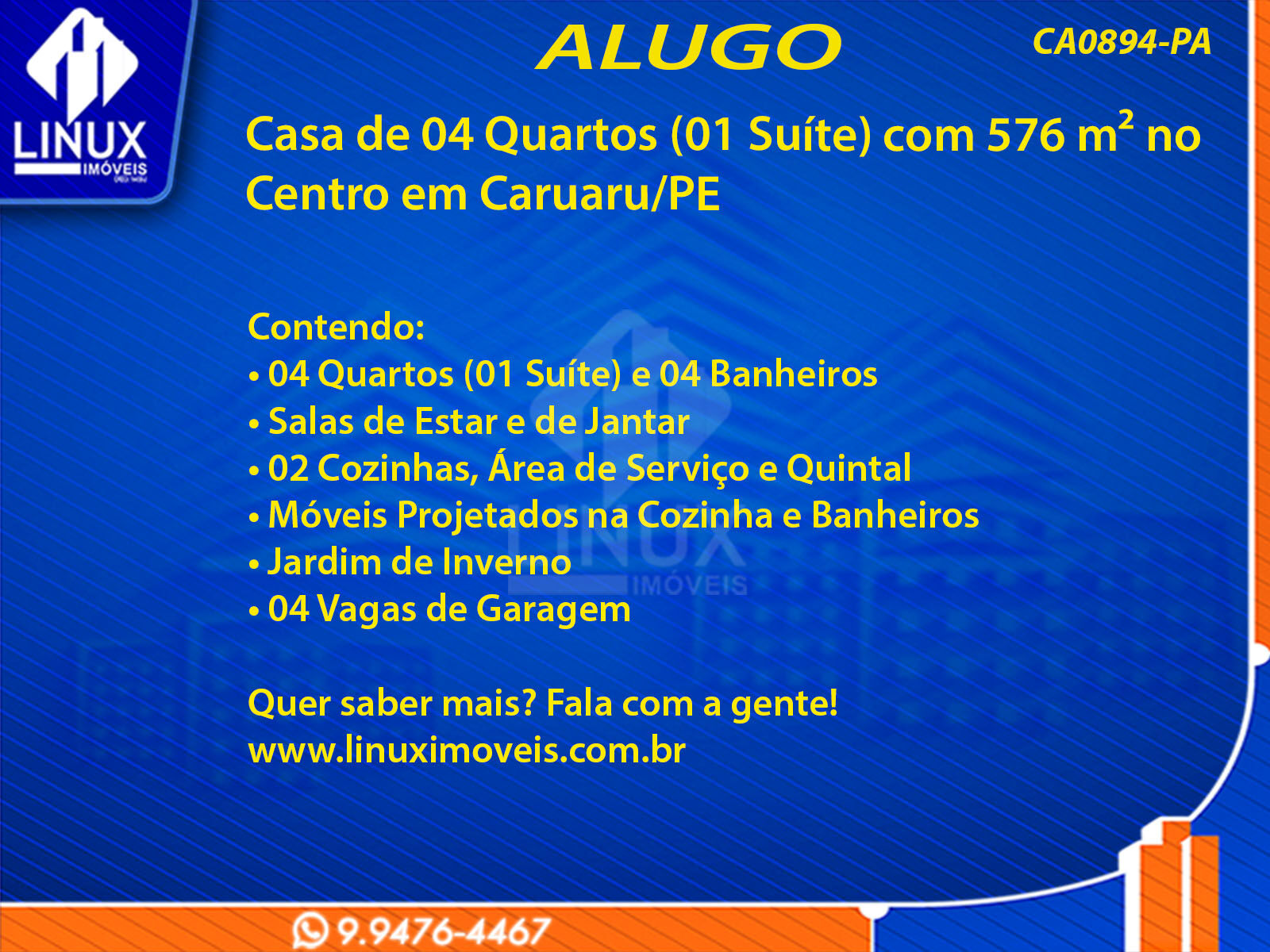 R$9.000,00 / ALUGUELCasa no Centro em Caruaru/PE p/ Locação (CA0894-PA)