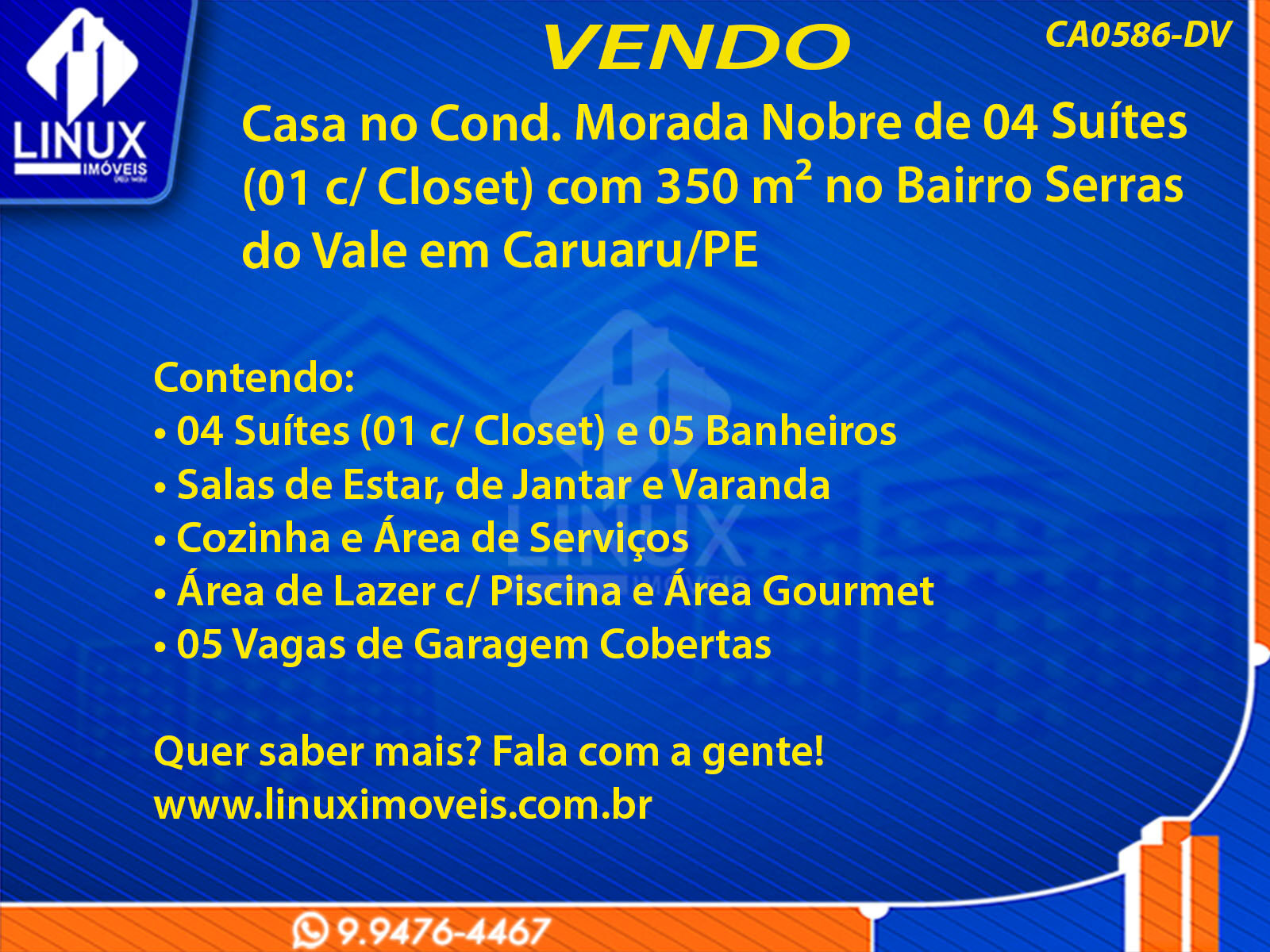 Casa no Cond. Morada Nobre de 04 Suítes (01 c/ Closet) com 350 m² Erguida num Terreno de 3.500 m² no Bairro Serras do Vale em Caruaru/PE
