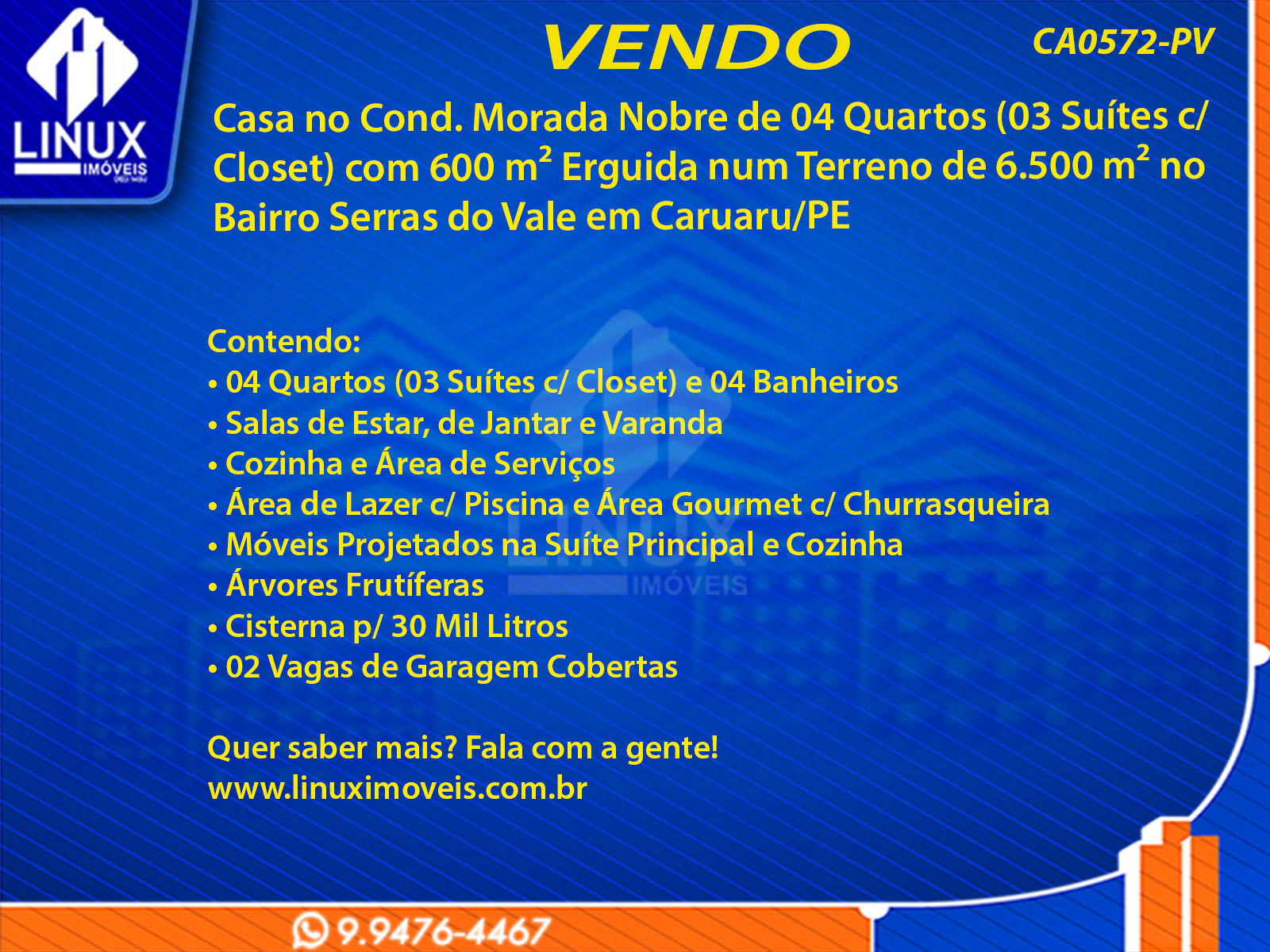 Casa no Cond. Morada Nobre de 04 Quartos (03 Suítes c/ Closet) com 600 m² Erguida num Terreno de 6.500 m² no Bairro Serras do Vale em Caruaru/PE