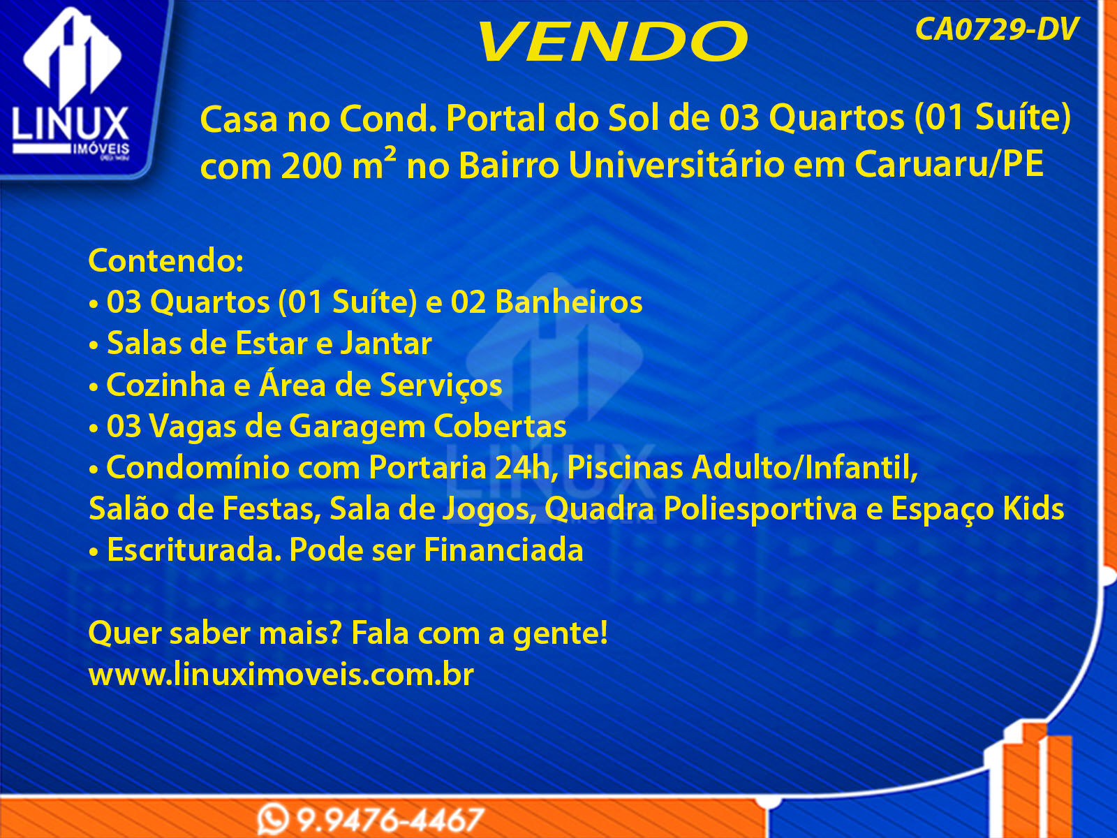 Casa no Cond. Portal do Sol de 03 Quartos (01 Suíte) com 200 m² no Bairro Universitário em Caruaru/PE