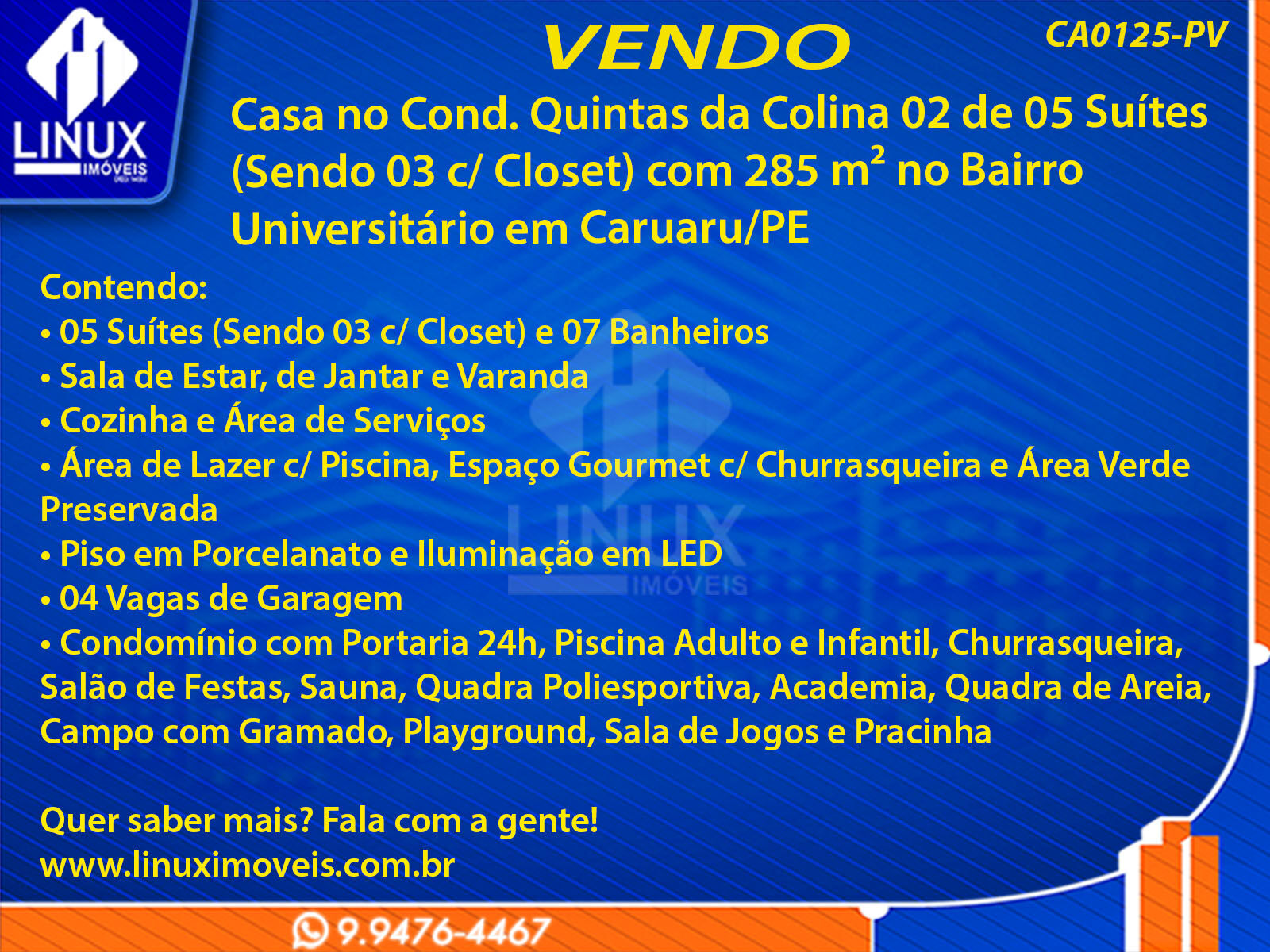 Casa no Cond. Quintas da Colina 02 de 05 Suítes (Sendo 03 c/ Closet) com 285 m² Erguida num Terreno de 450 m² no Bairro Universitário em Caruaru/PE