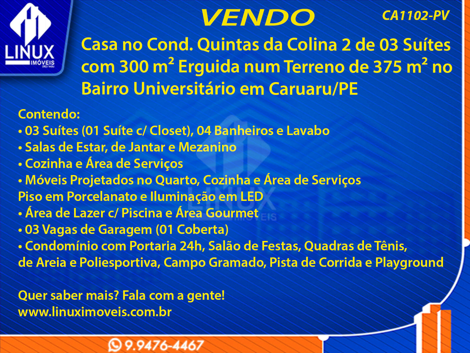 Casa no Cond. Quintas da Colina 2 de 03 Suítes com 300 m² Erguida num Terreno de 375 m² no Bairro Universitário em Caruaru/PE