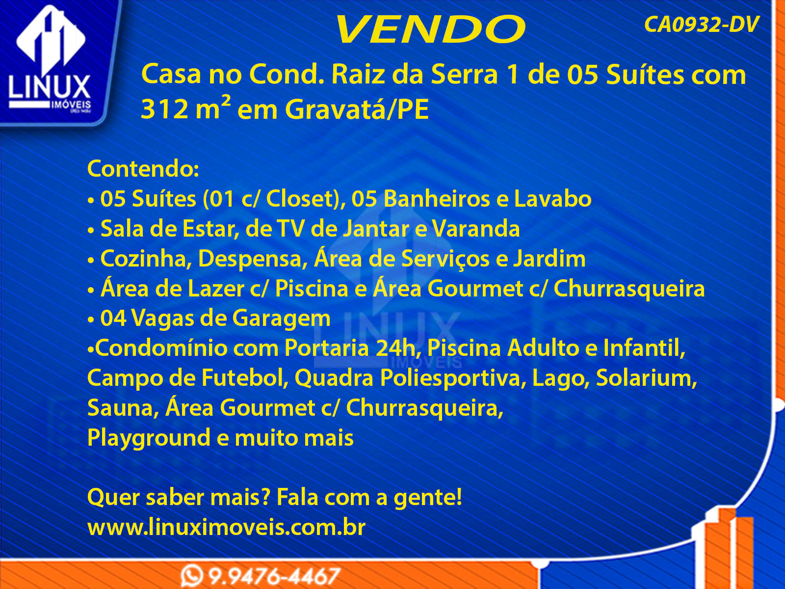 5 Dormitórios, sendo 5 suítes5 Banheiros4 Vagas