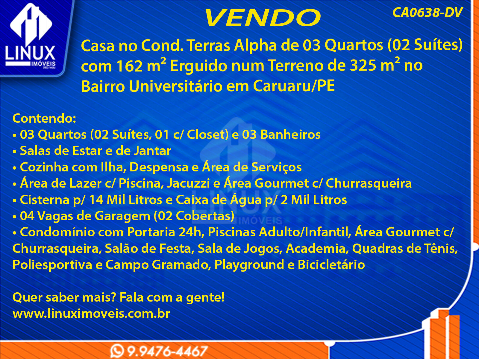 Casa no Cond. Terras Alpha de 03 Quartos (02 Suítes) com 162 m² Erguido num Terreno de 325 m² no Bairro Universitário em Caruaru/PE