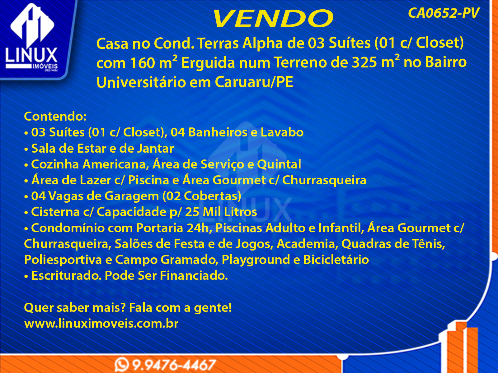 Casa no Cond. Terras Alpha de 03 Suítes (01 c/ Closet) com 160 m² Erguida num Terreno de 325 m² no Bairro Universitário em Caruaru/PE