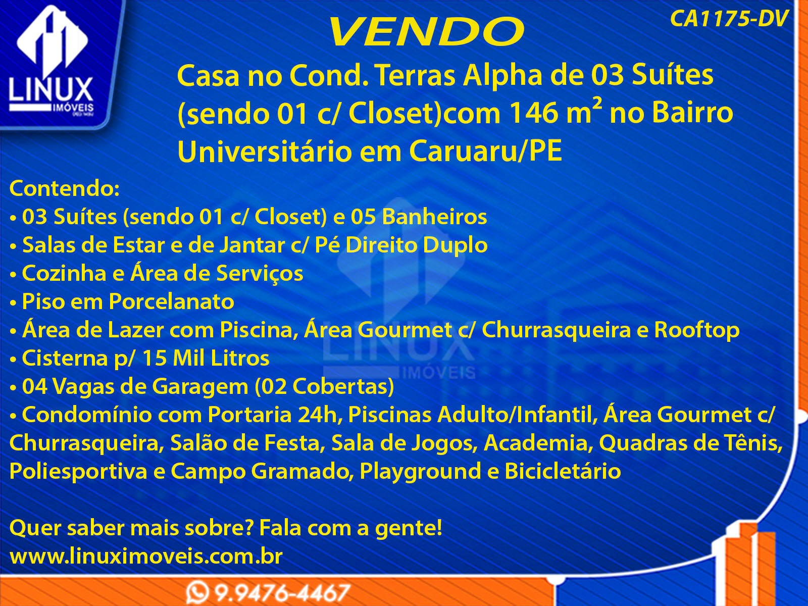 Casa no Cond. Terras Alpha em Caruaru/PE à Venda (CA1175-DV)