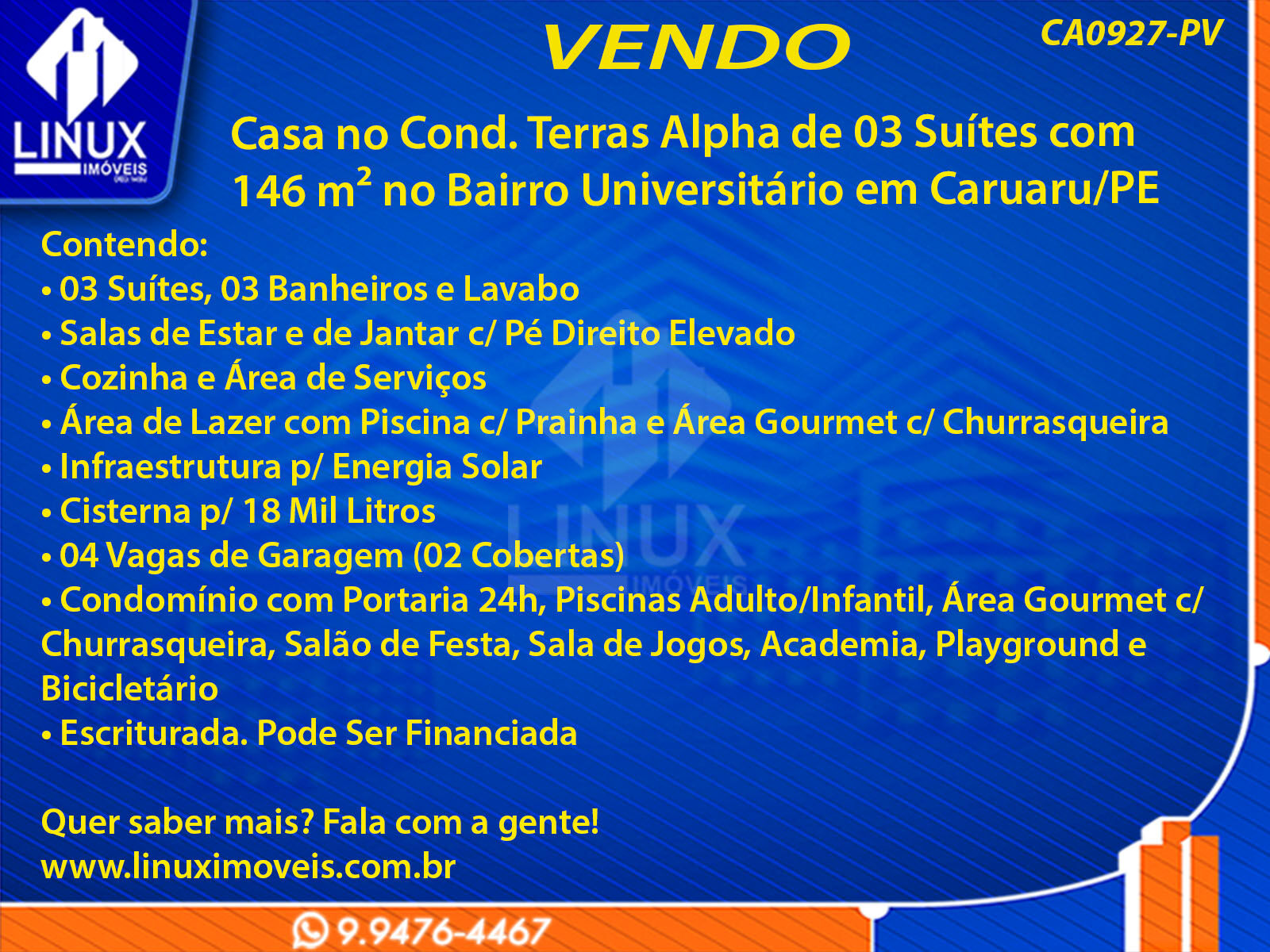 Casa no Cond. Terras Alpha em Caruaru/PE à Venda (CA0927-PV)
