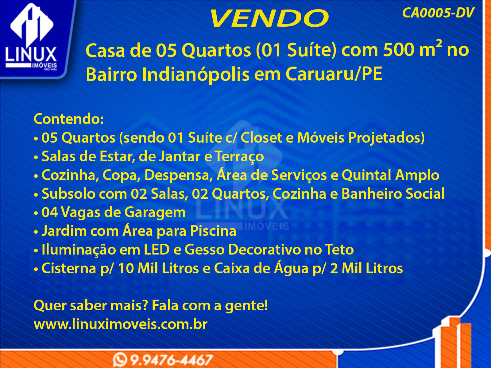 Casa de 05 Quartos (01 Suíte c/ Closet e Moveis Projetados) com 500 m² no Bairro Indianópolis em Caruaru/PE