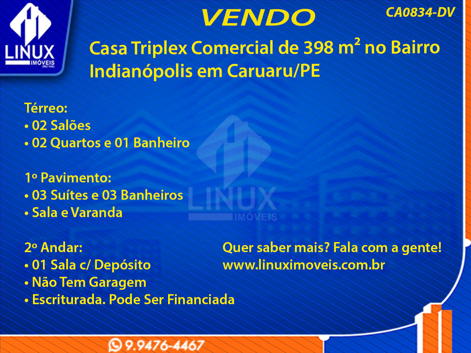 R$1.300.000,00 / VENDACasa Triplex Comercial no Bairro Indianópolis em Caruaru/PE à Venda (CA0834-DV)