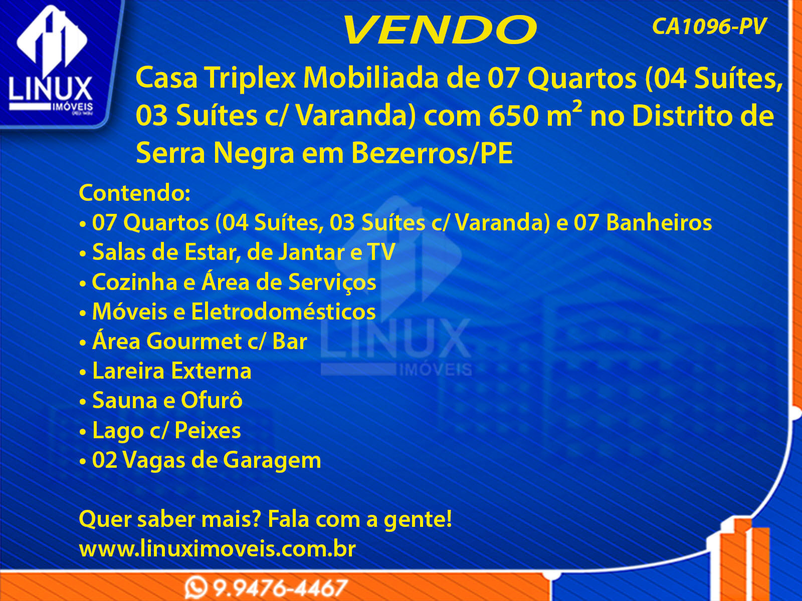 R$3.800.000,00 / VENDACasa Triplex Mobiliada no Distrito de Serra Negra em Bezerros/PE à Venda (CA1096-PV)