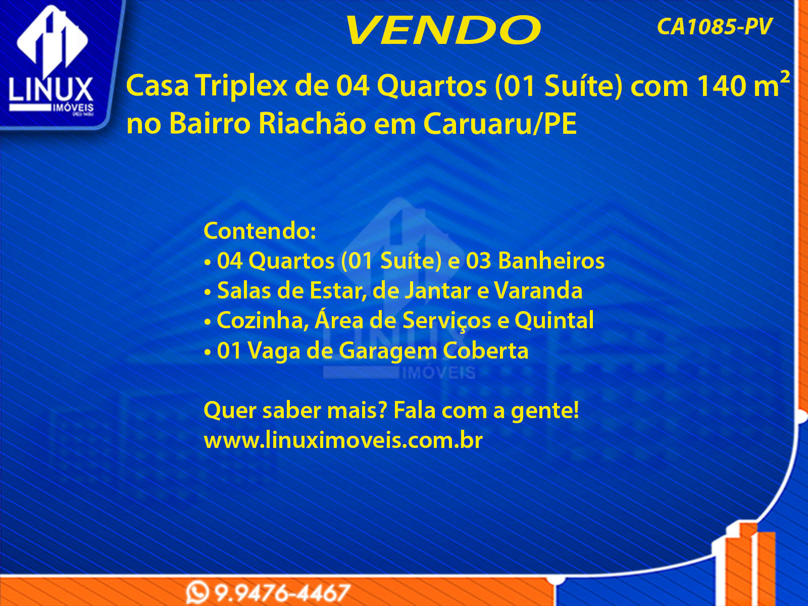 R$330.000,00 / VENDACasa Triplex no Bairro Riachão em Caruaru/PE à Venda (CA1085-PV)
