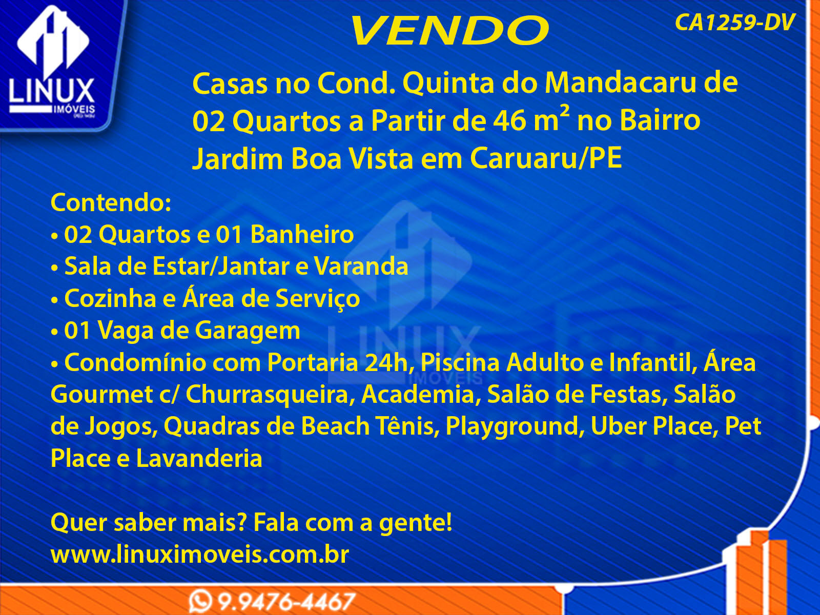 R$206.900,00 / VENDACasas no Cond. Quinta do Mandacaru em Caruaru/PE à Venda (CA1259-DV)