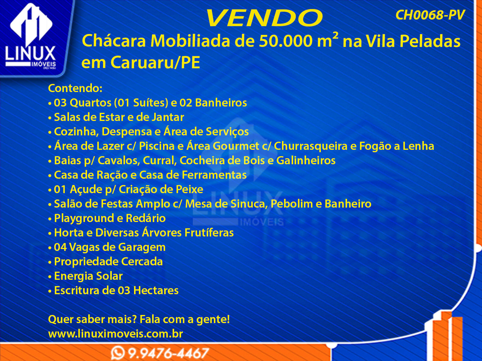 R$950.000,00 / VENDAChácara Mobiliada na Vila Peladas em Caruaru/PE à Venda (CH0068-PV)