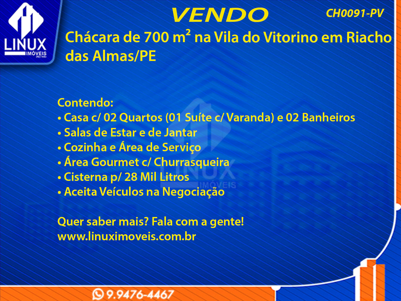 R$380.000,00 / VENDAChácara na Vila do Vitorino em Riacho das Almas/PE à Venda (CH0091-PV)