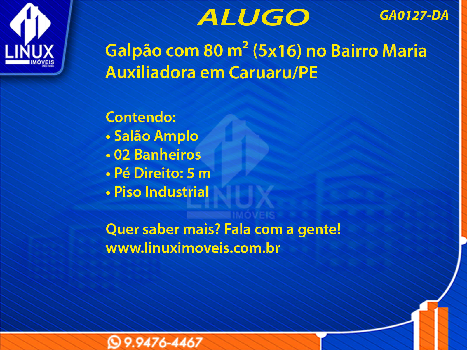 R$2.500,00 / ALUGUELGalpão no Bairro Maria Auxiliadora em Caruaru/PE p/ Locação (GA0076-DA)