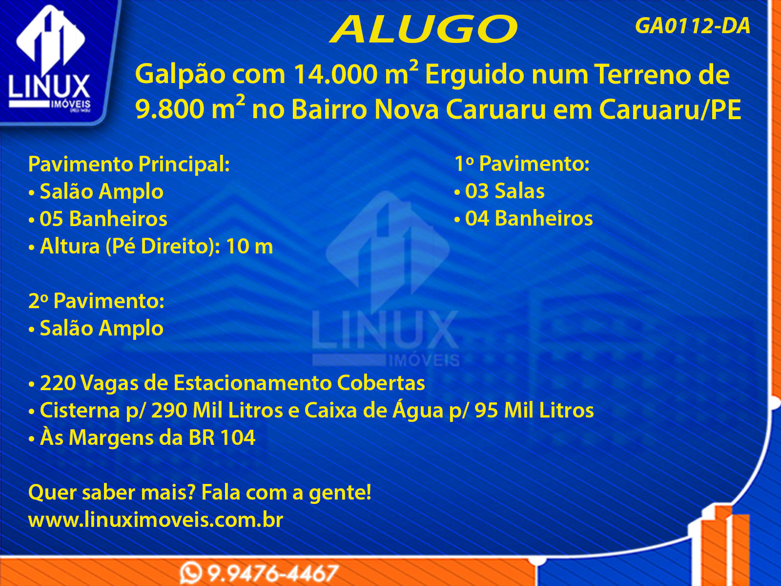 R$150.000,00 / ALUGUELGalpão no Bairro Nova Caruaru p/ Locação (GA0112-DA)