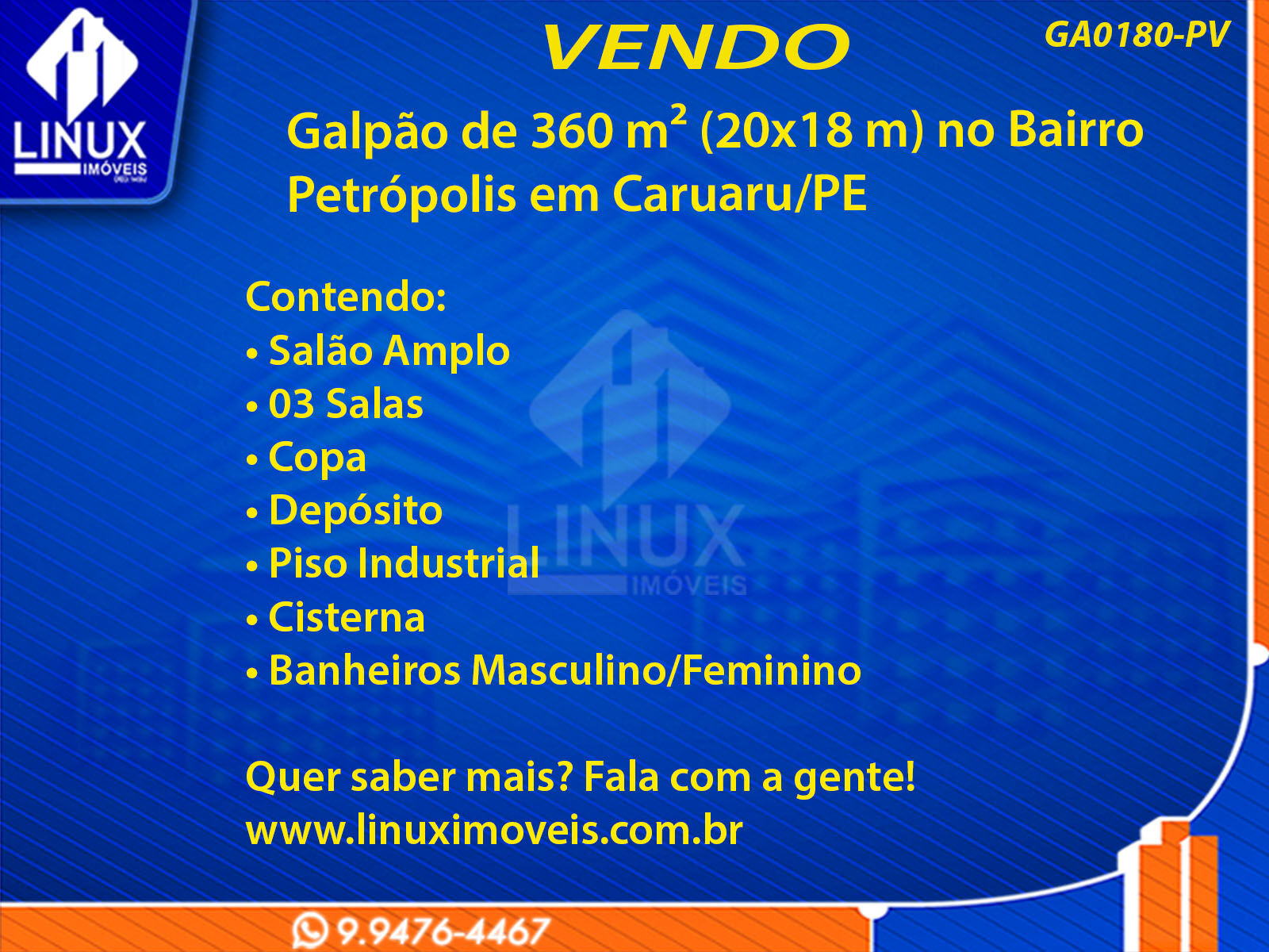 R$650.000,00 / VENDAGalpão no Bairro Petrópolis em Caruaru/PE à Venda (GA0180-PV)