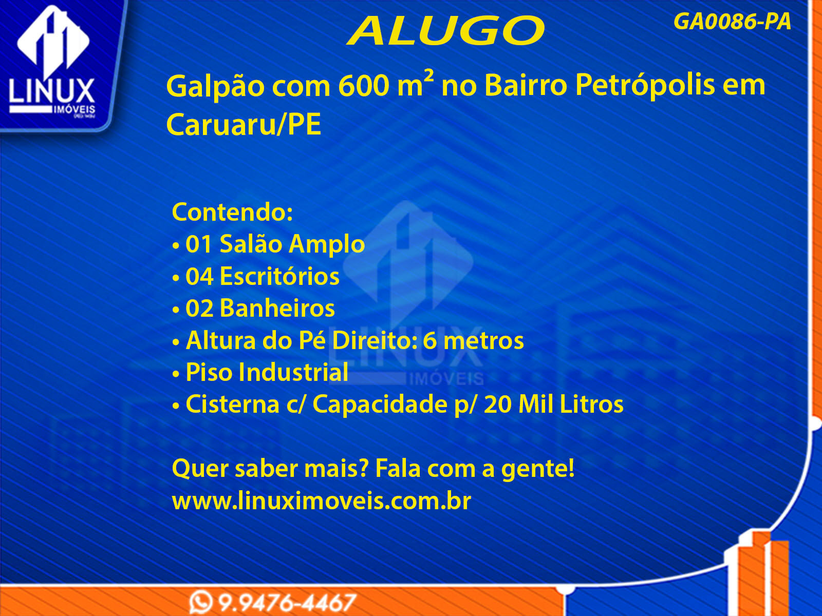 R$8.000,00 / ALUGUELGalpão no Bairro Petrópolis em Caruaru/PE p/ Locação (GA0086-PA)