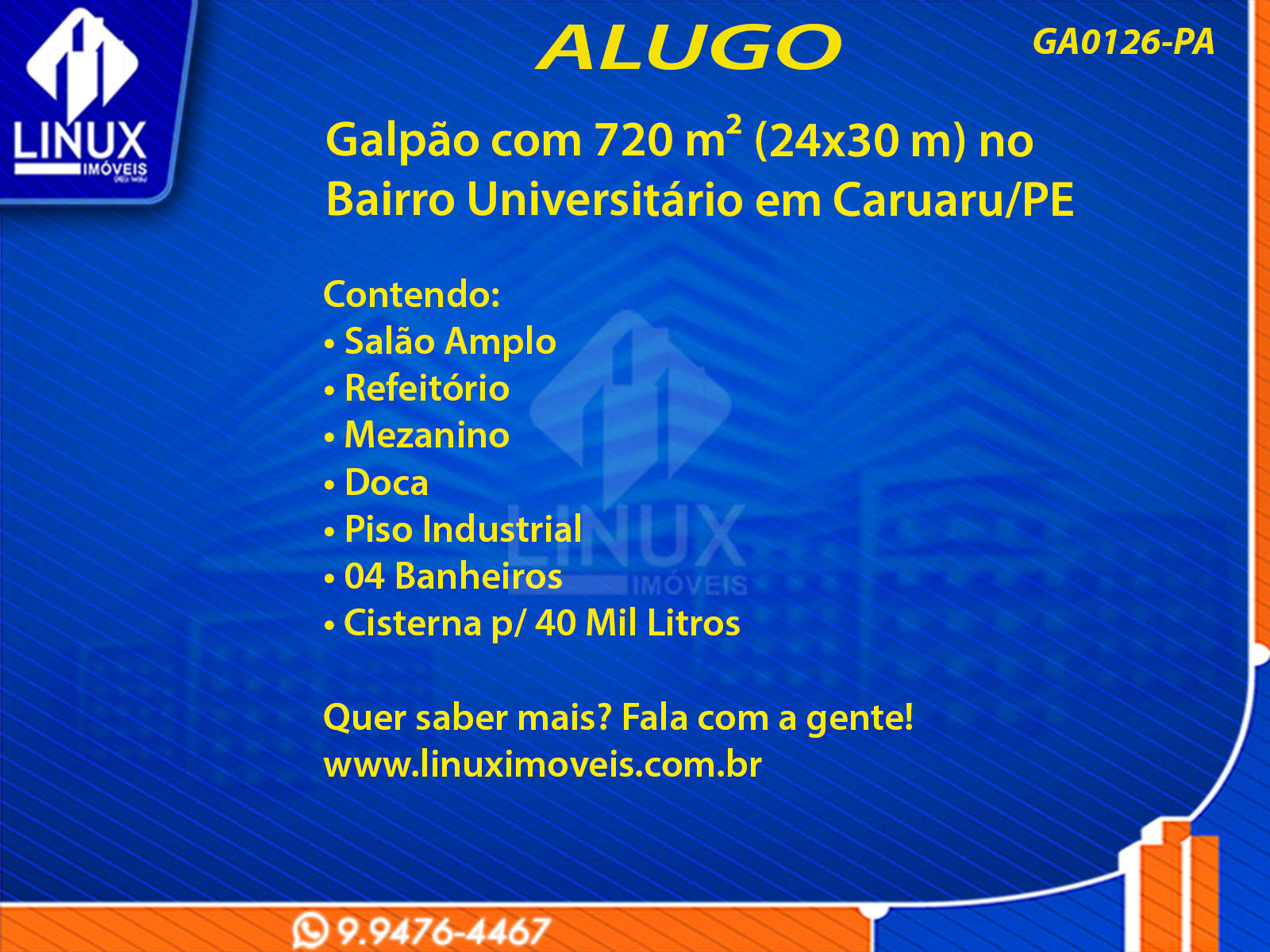 R$10.000,00 / ALUGUELGalpão no Bairro Universitário em Caruaru/PE p/ Locação (GA0126-PA)