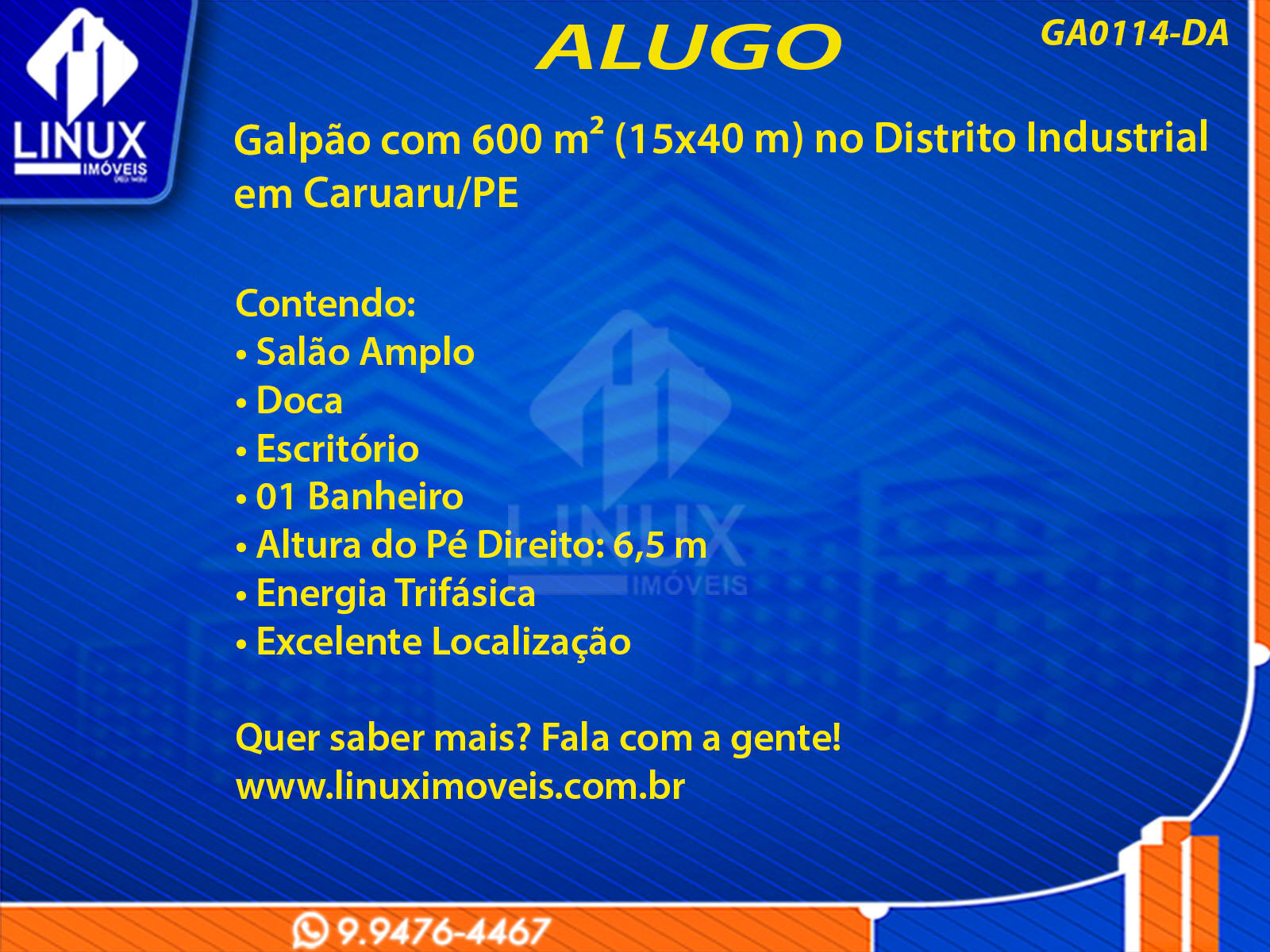 Galpão com 600 m² (15x40 m) no Distrito Industrial em Caruaru/PE