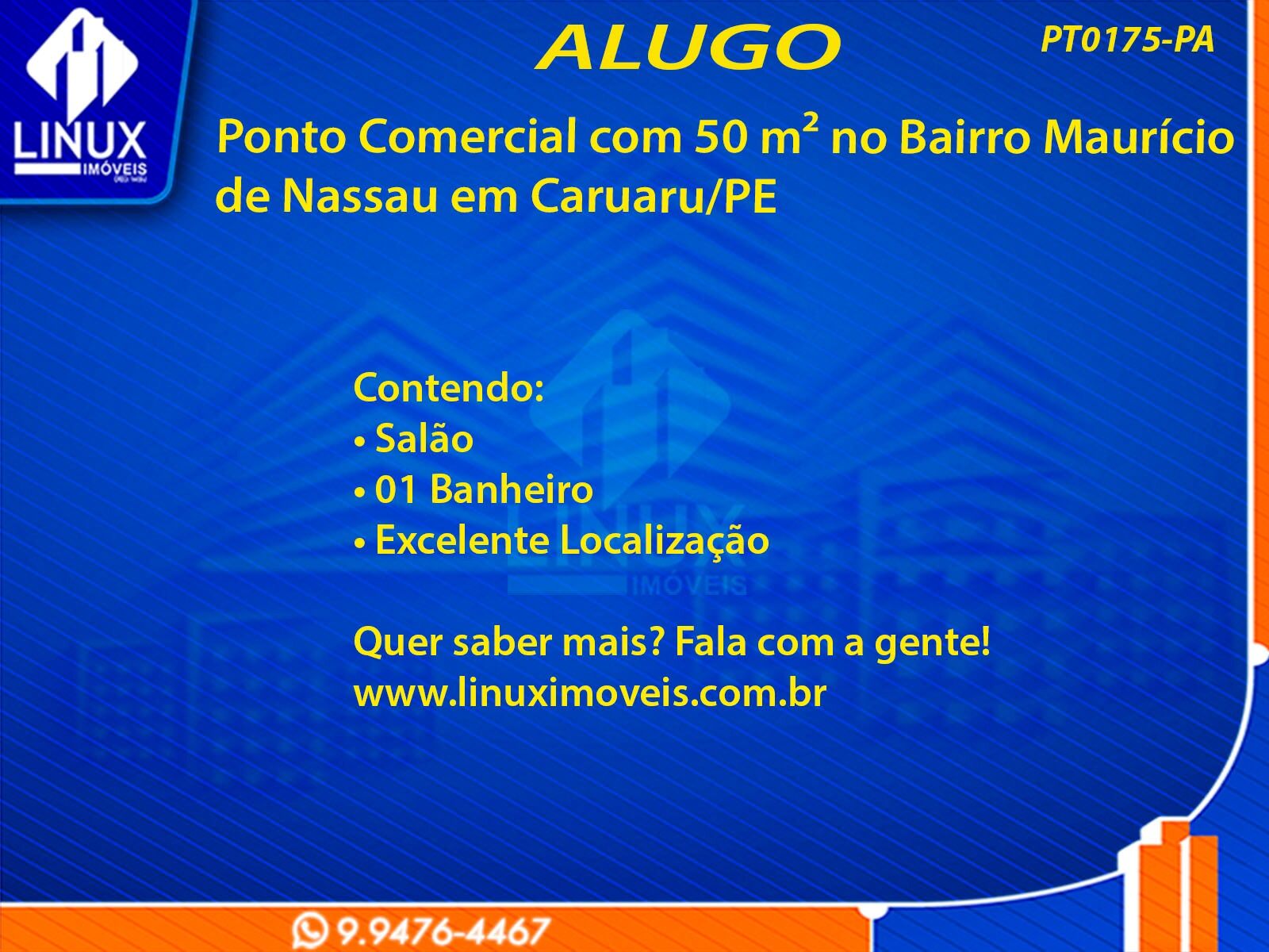 R$1.250,00 / ALUGUELPonto Comercial no Bairro Maurício de Nassau em Caruaru/PE p/ Locação (PT0175-PA)