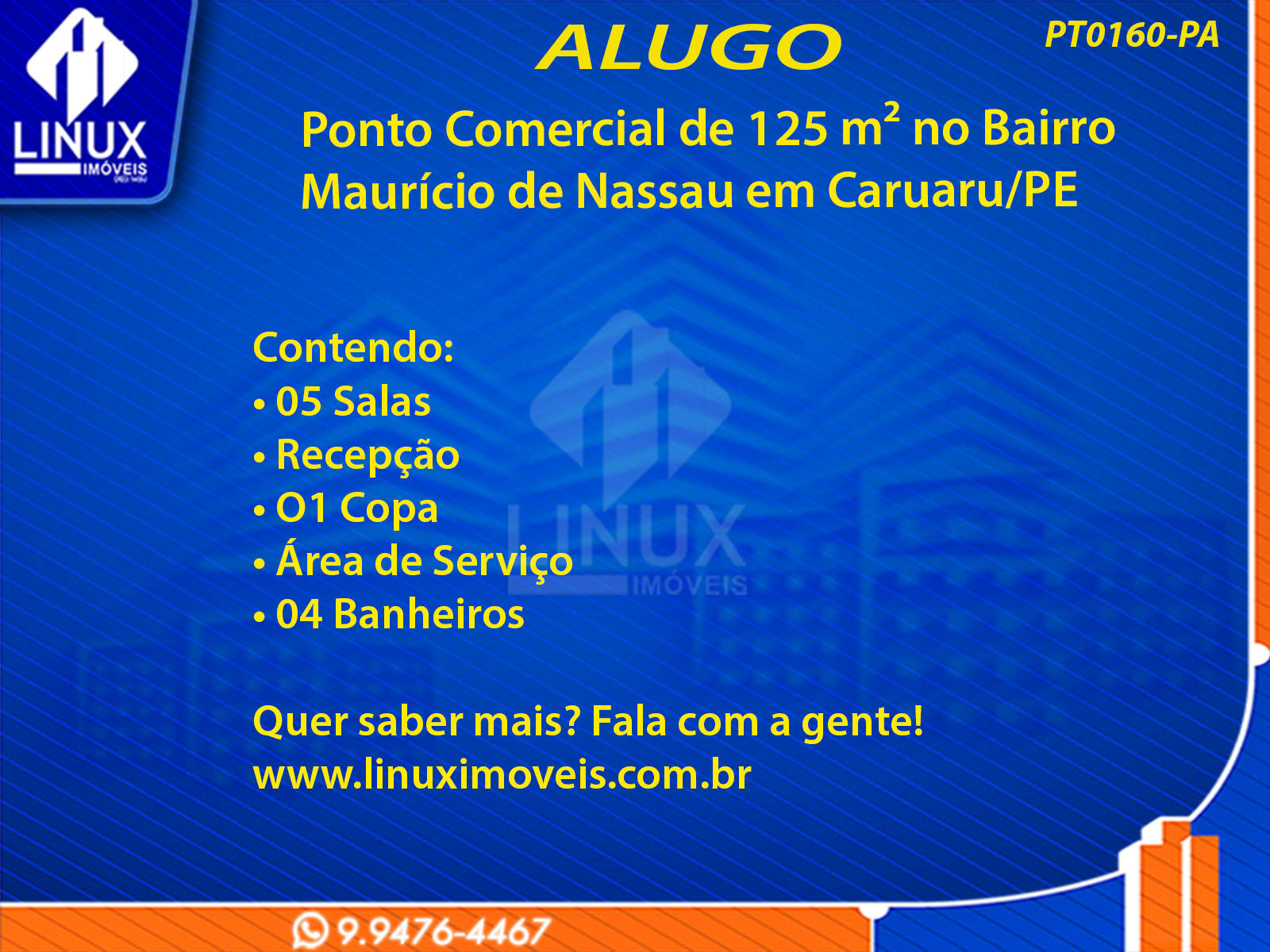 R$4.500,00 / ALUGUELPonto Comercial no Bairro Maurício de Nassau em Caruaru/PE p/ Locação (PT0160-PA)
