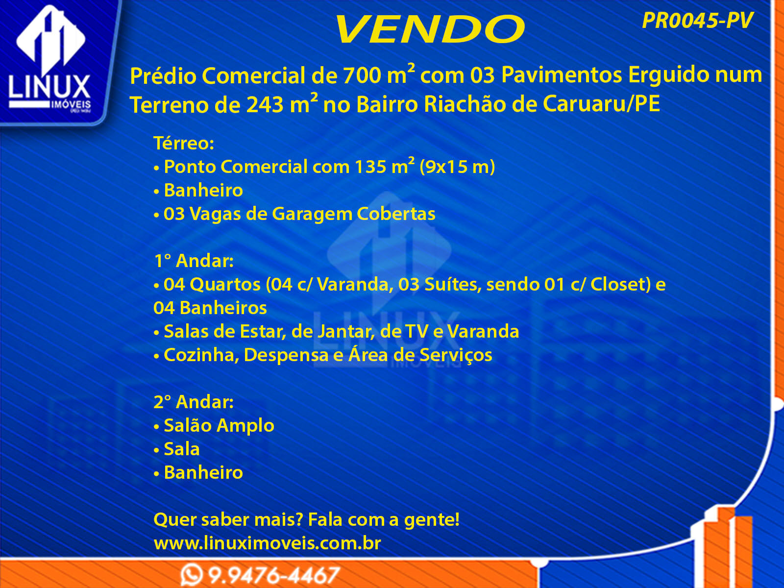 R$1.200.000,00 / VENDAPrédio Comercial no Bairro Riachão em Caruaru/PE à Venda (PR0045-PV)