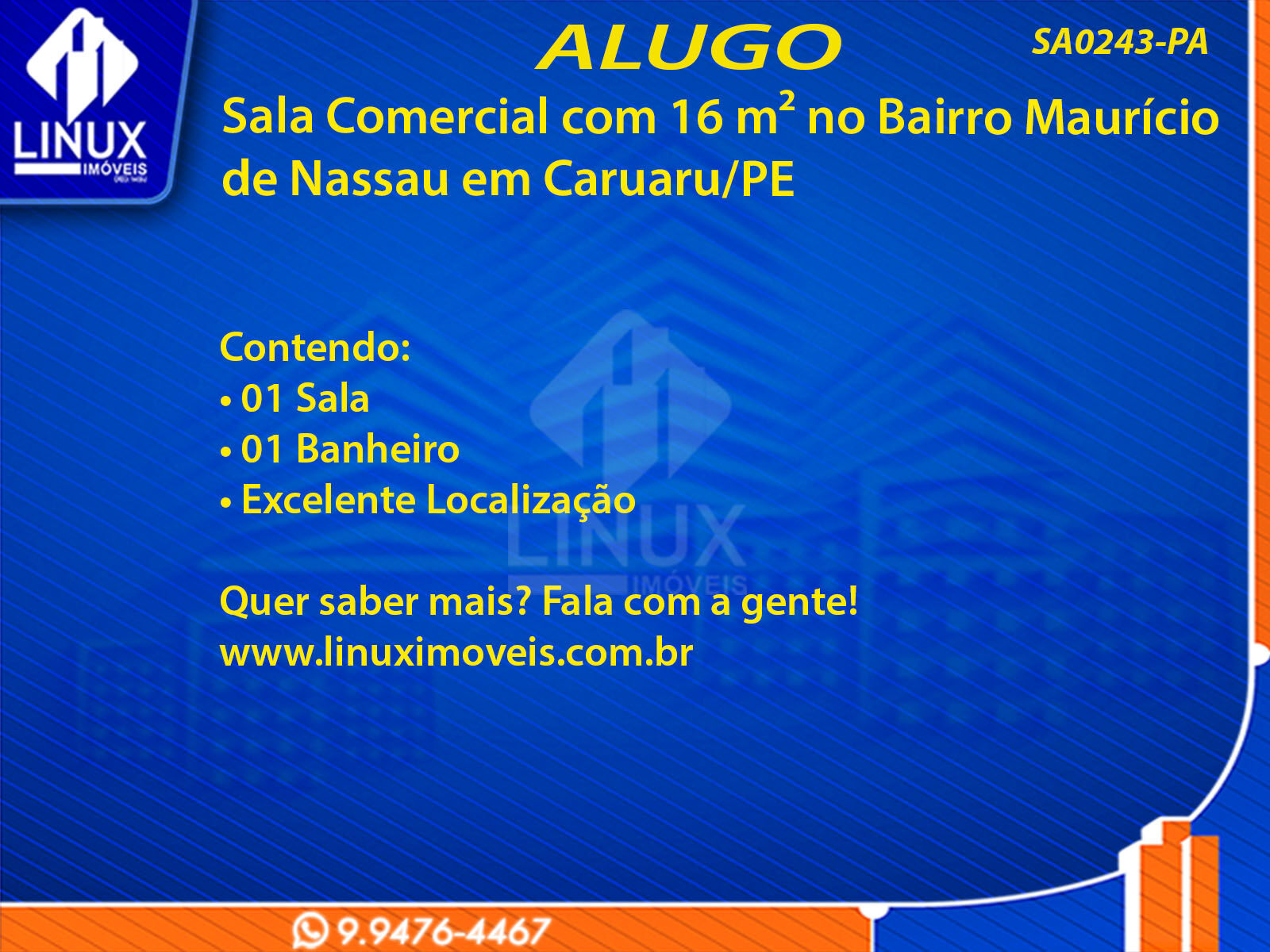 R$1.100,00 / ALUGUELSala Comercial no Bairro Maurício de Nassau em Caruaru/PE p/ Locação (SA0243-PA)