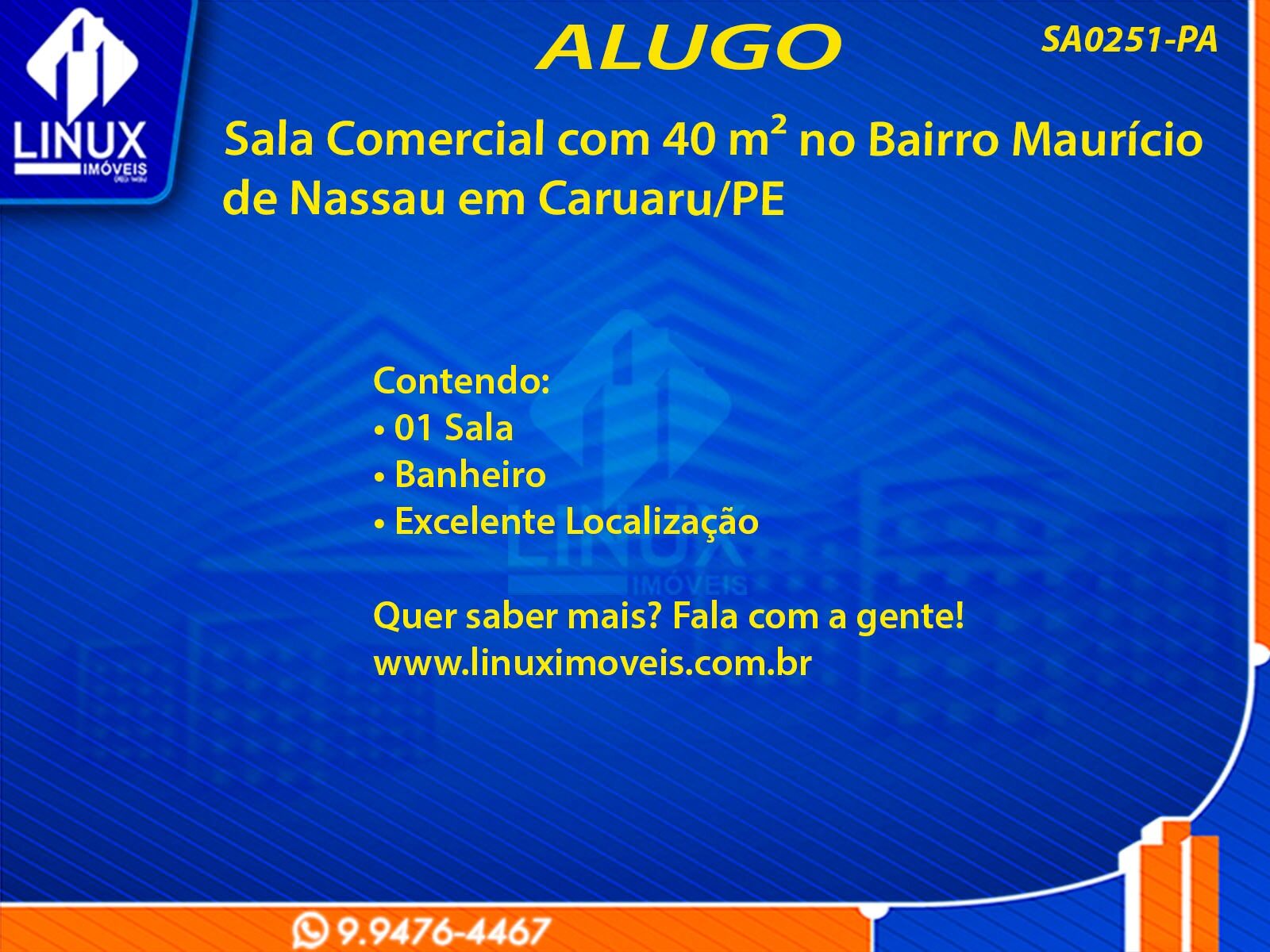 R$1.100,00 / ALUGUELSala Comercial no Bairro Maurício de Nassau em Caruaru/PE p/ Locação (SA0251-PA)